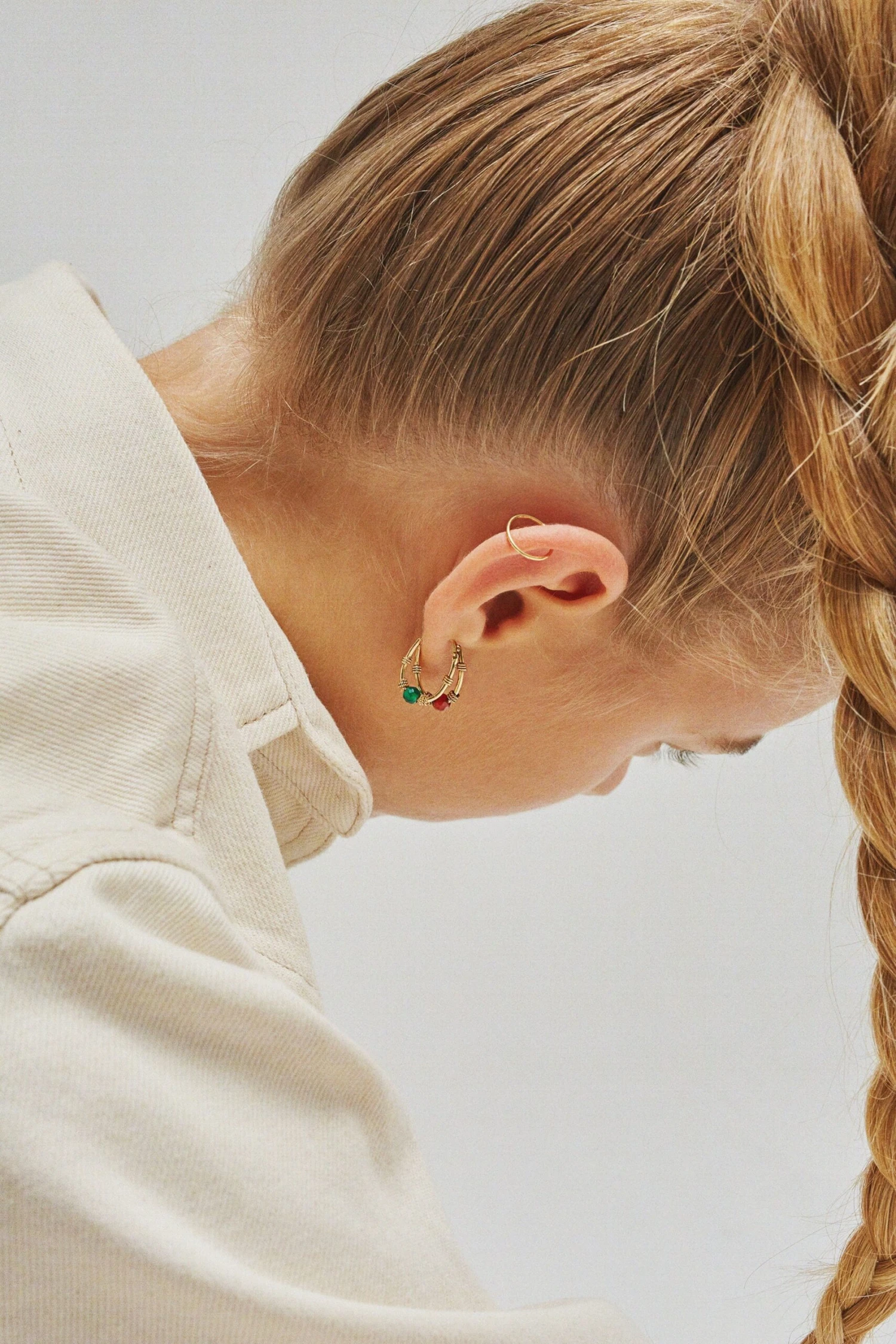 ZINC est une paire de boucles d’oreilles en vermeil, ornée d’une pierre semi-précieuse (onyx vert foncé).