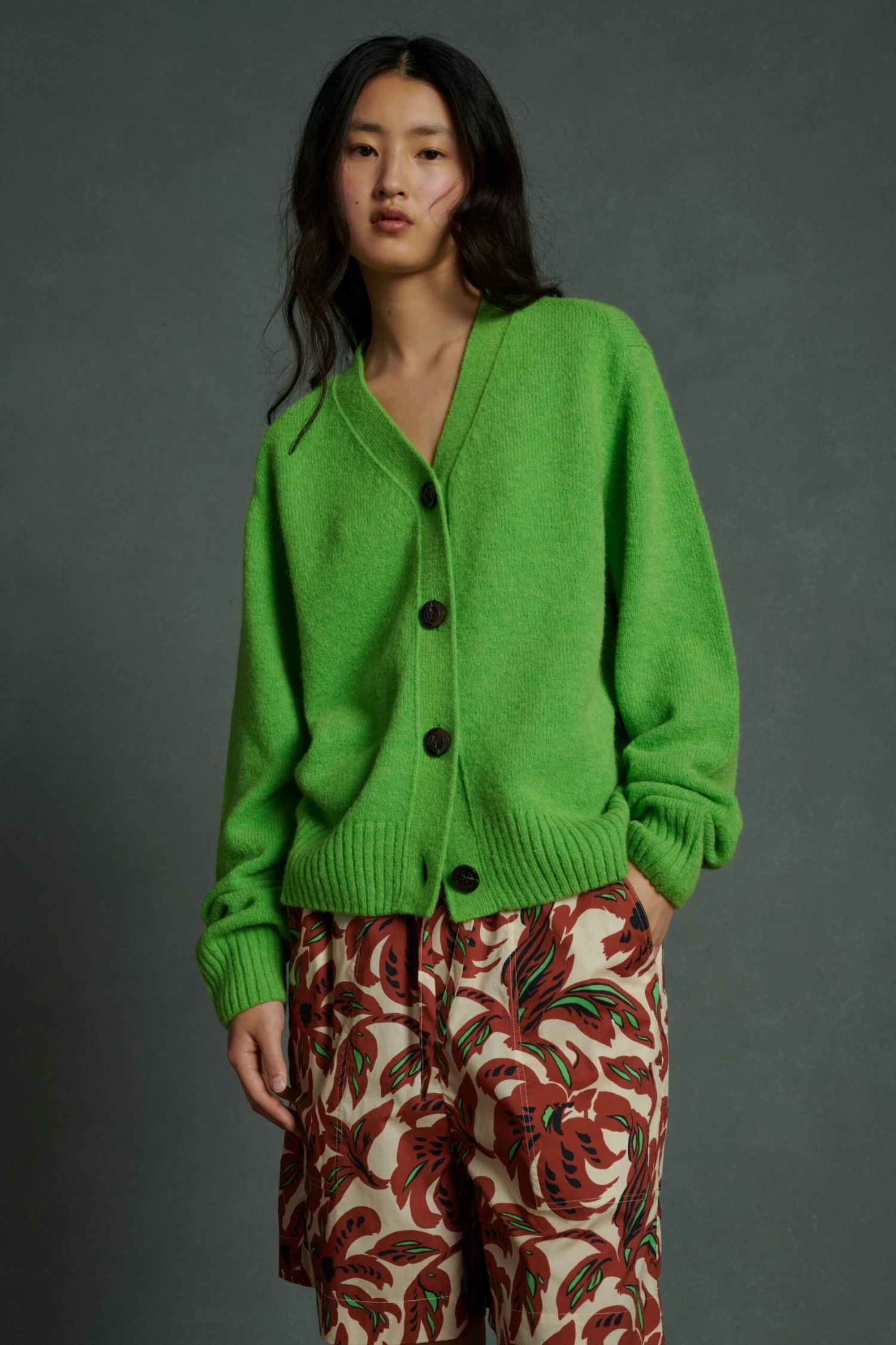 ALESIA est un cardigan oversize en laine mélangée à large encolure en V. Il est tricoté dans une maille incontournable du vestiaire Soeur, à la main duveteuse (poil long laine d’Alpaga). Sa couleur exceptionnelle verte fluo a été développée en exclusivité pour apporter une touche vitaminée à notre collection d’été.