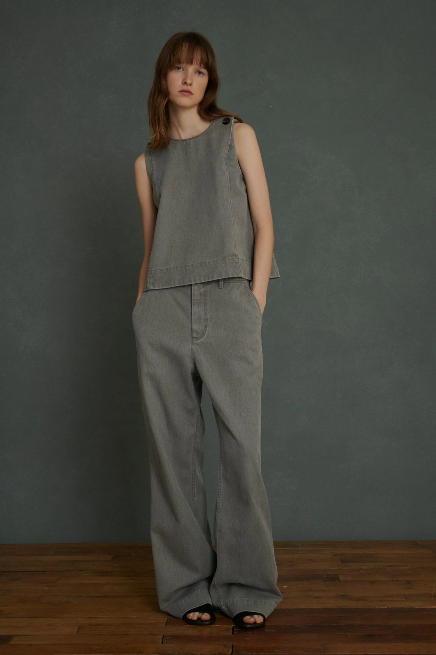 AURORE est un top sans manches en toile de denim souple. L’emmanchure carrée ajoute à son volume ample et trapèze. Un panneau au milieu est fixé à mi-hauteur et apporte du mouvement. Un bouton au côté décore l’encolure et facilite l’enfilage. A porter en total look avec le jean ALISSIO assorti pour un total look monochrome.