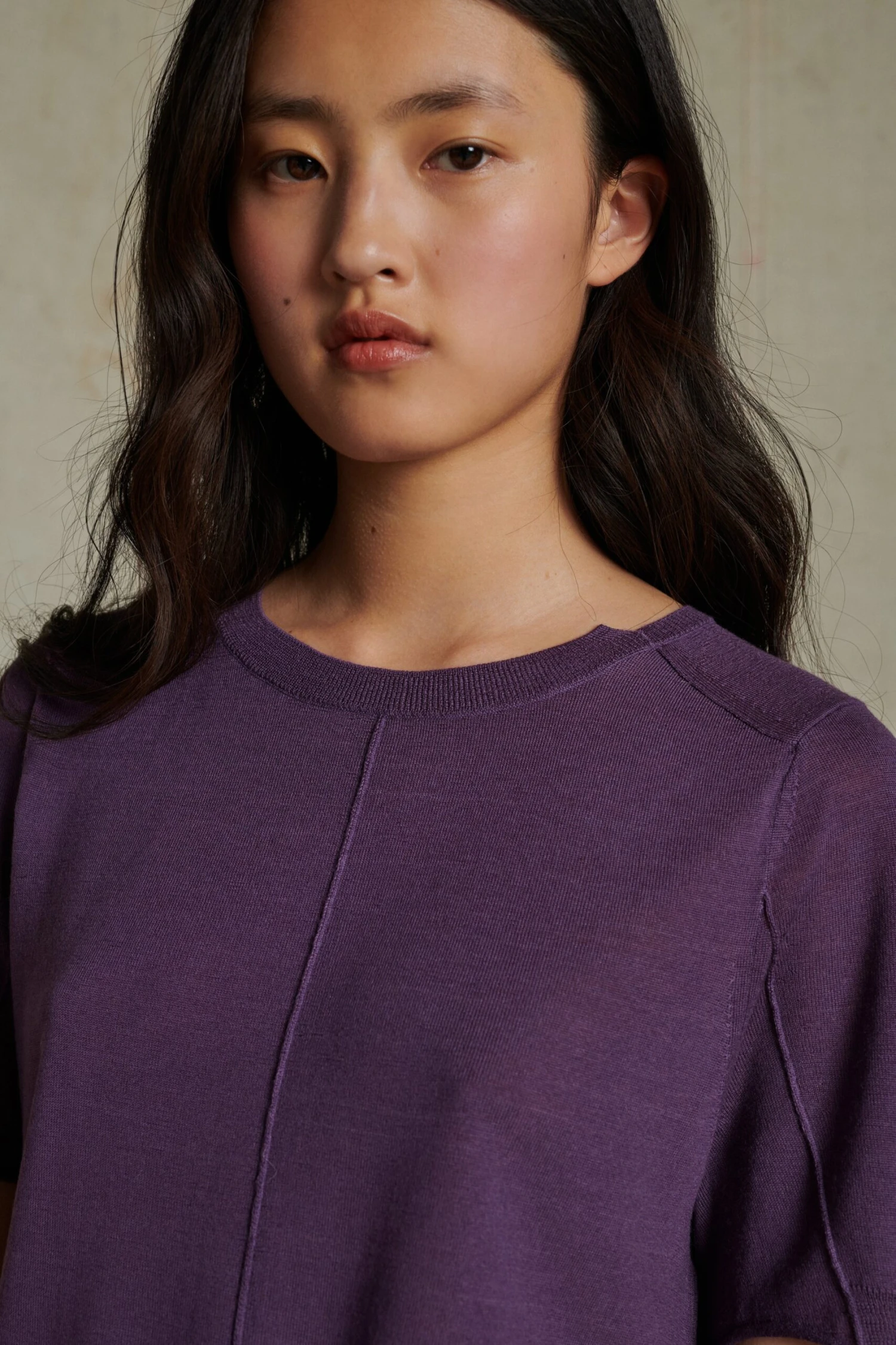 Pull manches courtes violet en laine mérinos extra-fine aux finitions asymétriques