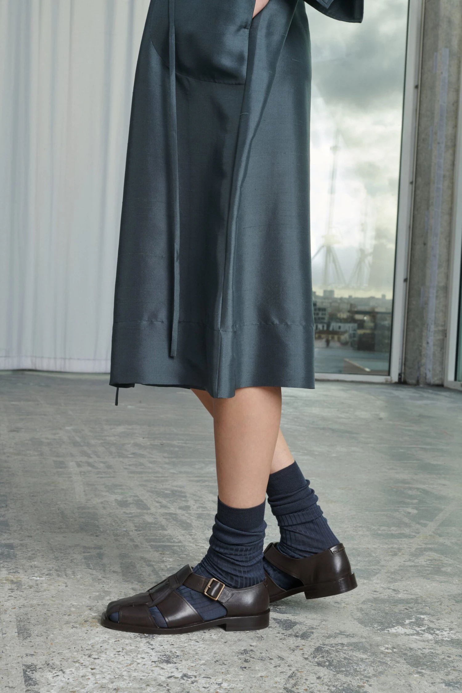 VELIKA est une paire de sandales plates en cuir souple. Elle présente une tige effet cage constituée de bandes de cuir tressées. Un petit talon carré réhausse la semelle. Portées avec une paire de chaussettes épaisses, elles traverseront la mi-saison.