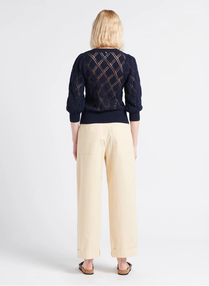 Ce modèle est présenté avec Pull col rond ajouré en coton by SUD EXPRESS, Ceinture en cuir by GERARD DAREL, Mules plates en cuir by SOEUR